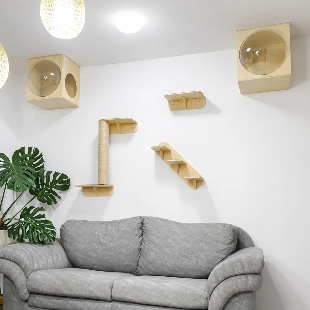 El Combo #19 es un completo sistema de enriquecimiento felino en muro, diseñado para transformar una pared de tu hogar en un circuito dinámico donde tu michi pueda trepar, descansar, explorar y afilar sus uñas de forma natural 😺✨.