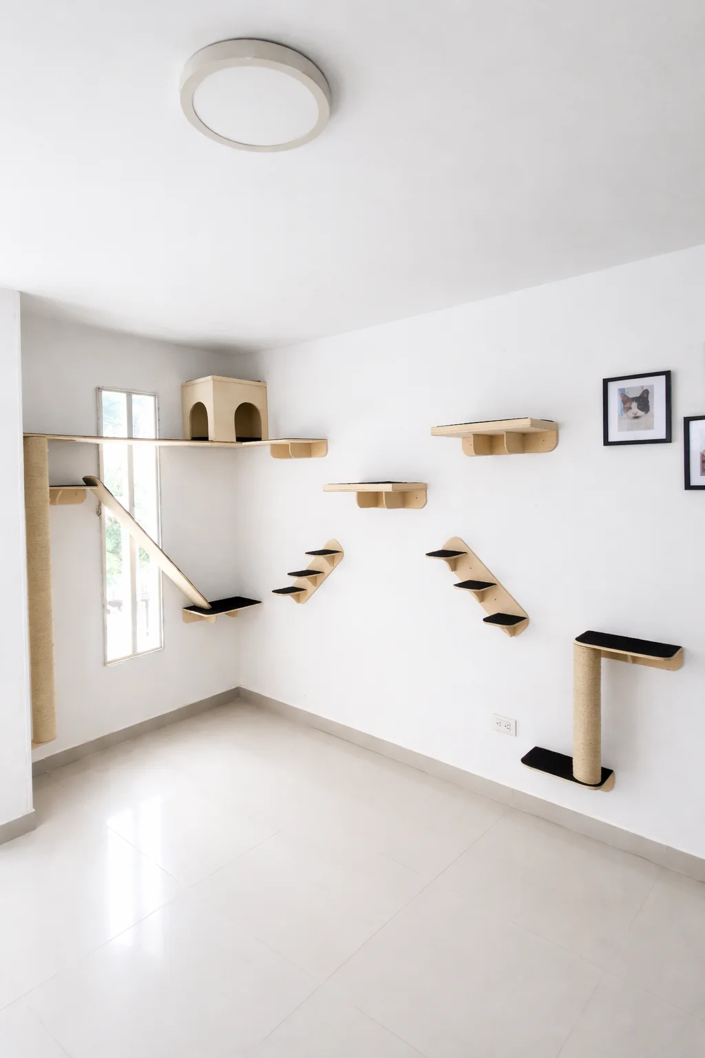 Este conjunto combina repisas funcionales y elementos de rascado que estimulan el instinto natural de salto, vigilancia y juego, creando una pared interactiva perfecta para gatos activos o curiosos.