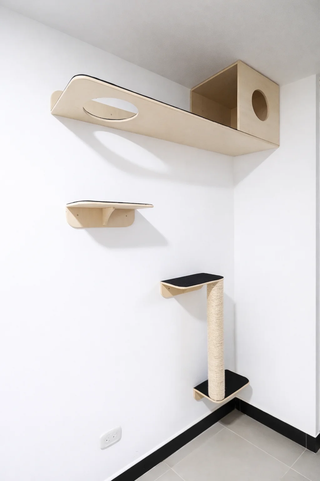 El Combo #6 es una solución completa para consentir y mantener activos a tus gatos. Con múltiples plataformas, cueva, repisa burbuja, comederos individuales y un soporte especial para el arenero, tu michi tendrá un espacio único para trepar, jugar, descansar y explorar todos los días. 😺🏡
