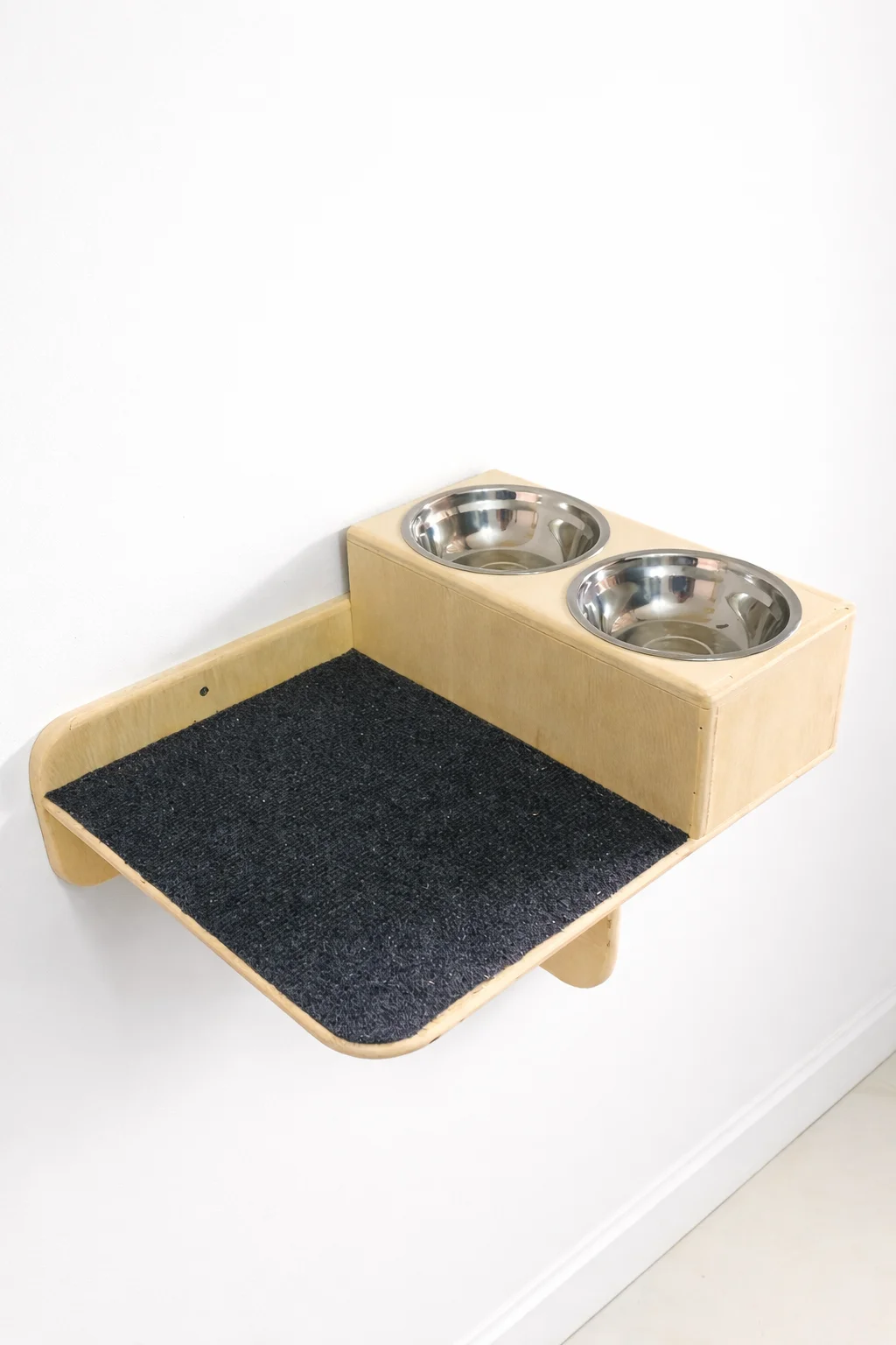 La Repisa Comedero Doble es un módulo funcional diseñado para combinar zona de descanso y área de alimentación en un solo espacio. Su diseño incluye una plataforma acolchada donde tu michi puede relajarse, junto con un soporte elevado con dos platos metálicos para comida y agua 😺✨.